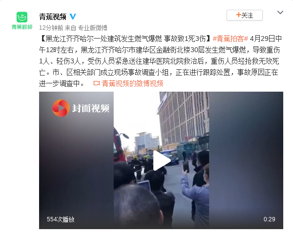 4月29日中午12时左右,黑龙江齐齐哈尔市建华区金融街北楼30层发生燃气爆燃,导致重伤1人、轻伤3人,受伤人员紧急送往建华医院北院救治后,重伤人员经抢救无效死亡。市、区相关部门成立现场事故调查小组,正在进行跟踪处置,事故原因正在进一步调查中。