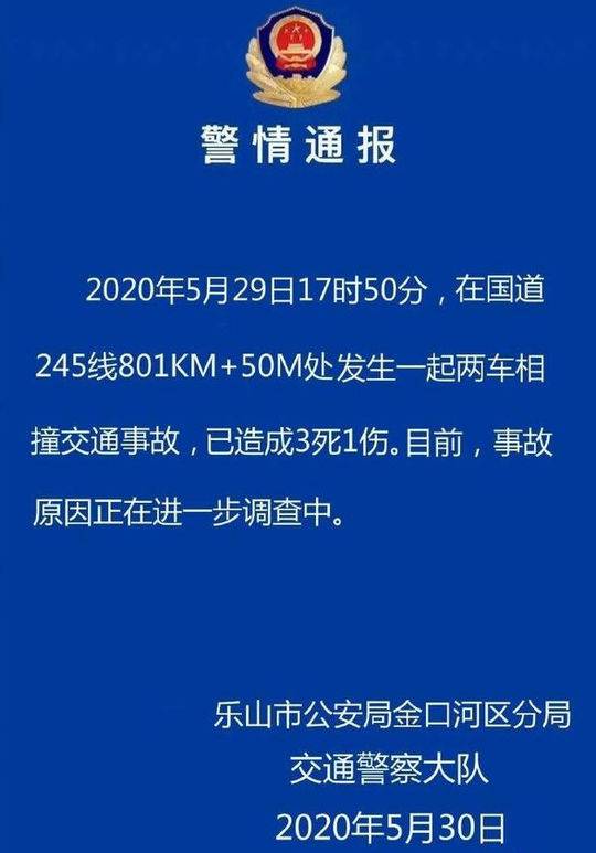 5月30日,四川省乐山市公安局金口河区分局发布警情通报:5月29日17时50分,在国道245线801KM+50M处发生一起两车相撞交通事故,已造成3死1伤。目前,事故原因正在进一步调查中。